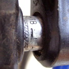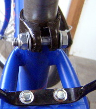 Falls der Sattelbolzen bricht oder sich beim Anziehen der Klemmung verbiegt, kann der Original-Sattelbolzen auch problemlos durch eine Schraube M8x40mm aus dem Baumarkt ersetzt werden (links im Bild). Im Eisenwarenhandel sind darüber hinaus Schrauben der Abmessung M8x40mm mit Sechskant oder Inbus auch als "hochfeste Schrauben" in der Festigkeitsklasse 10.9 oder sogar 12.9 (statt normal 8.8) erhältlich, die mehr Reserven gegen Bruch und Verbiegen bieten. |